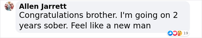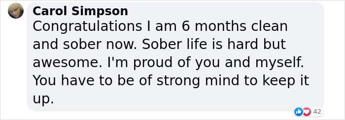 “Hats off, I’ve now been sober and clean for 8 years, navigating through life’s challenges day by day. May your journey grant you 55 more years of sober and clean triumphs,” one comment read.