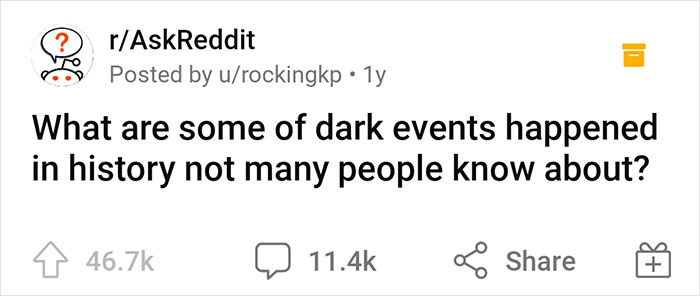 We often applaud and raise toasts to historical heroes who showed kindness and courage to make society a bit better. But unfortunately, there’s no escaping that not every part of our past is worth celebrating. So user rockingkp reached out to fellow members of Ask Reddit to learn more about the dark and disturbing historical events few people know about.
