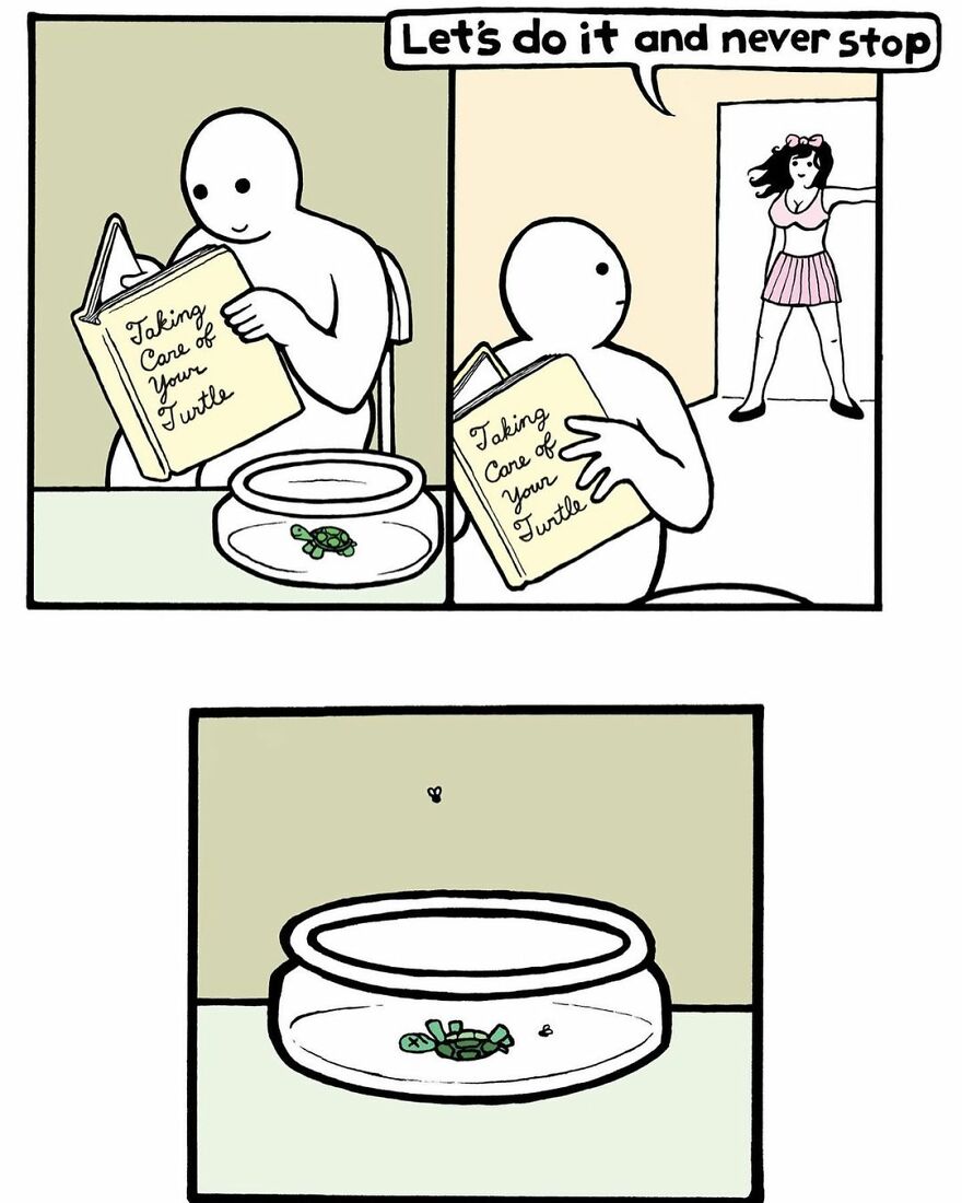Artist continued telling more about how the comics are created: “In every case though, I think there has to be some insight into “how it plays”. And this requires the sober process of looking at it without author bias and instead focusing on what could be happening if it were real. Or not real. Can I zig when people might be expecting a zag? It’s a strange process probably, achievable when mental illness and diligence get together. In many ways, a lot of art functions no better than a circus sideshow - ‘look at how weird this thought process is!’”