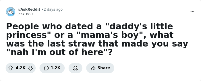 Interview With ExpertThe stereotypes of "daddy's princess" and "mama's boy" are pretty hated in pop culture. One is usually called entitled for getting a lavish summer trip to Europe or an expensive college tuition just by asking nicely, and the other is considered spoiled for not having to clean or do his own laundry even after moving out of his parents' house. So, Reddit user Jesk_680 wanted to find out if they're really that bad and asked everyone who had dated these characters to share why they ultimately decided to end the relationship. Continue scrolling to check out the stories and don't miss the conversation we had with clinical psychologist Dr. Sabrina Romanoff — you'll find it in between the entries.