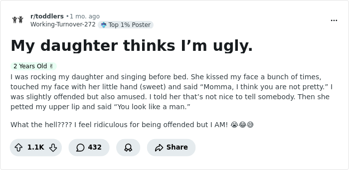 It all began with a woman’s post on the Toddlers subreddit, in which her young daughter told her she is “not pretty” and that she looks “like a man.” Other parents shared their own experiences, from tiny tots telling their moms to get their eyebrows done to kids fat-shaming their parents in the most hilarious ways.
