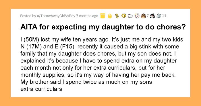 A dad asked the ‘AITA’ community over on Reddit if he was in the wrong for making his daughter do extra chores because he has to “spend extra” on her each month because of her periods. Let me repeat that: this dad makes his teenage daughter do chores as a way to ‘pay him back’ because he spends additional money each month on her because of her biology.