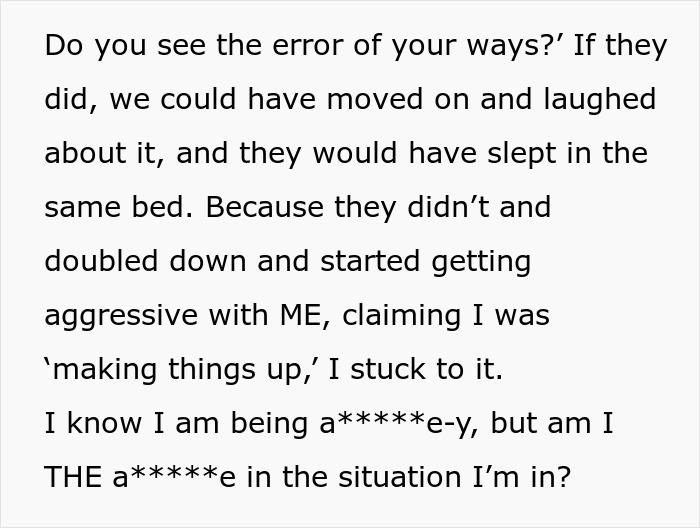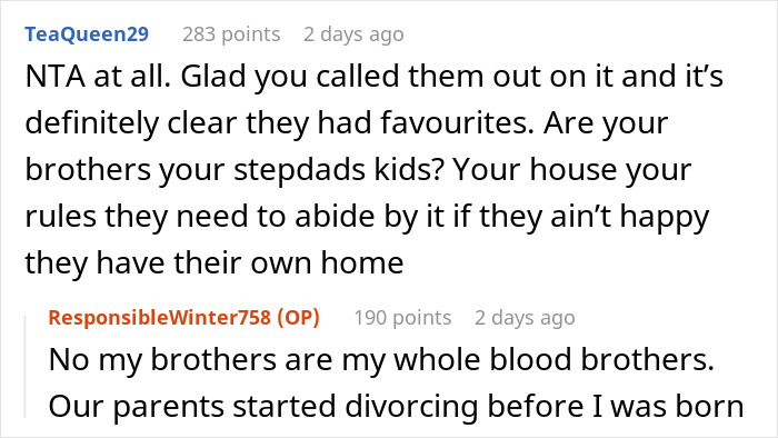 Load More Replies...I don't understand the parents at all. They trusted their boys not to sneak into the spare room, but didn't trust the daughter's boyfriend not to? Is that it? Any parent who automatically thinks their kid is better behaved than someone else's is kidding themselves (generally speaking). I think it just comes down to, as one person said, they could ignore someone else's daughter, and their own sons, being "immoral" but not their own daughter. Straight up sexist double standards.