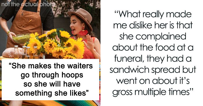 Load More Replies...NTA. I wouldn't invite such a person anywhere either. It's not about pickiness itself, it's about her behaviour. Instead of harassing the restaurant staff just pick something you can eat for sure and tell them in advance not to add anything if it's so important. Her behaviour at the funeral is absolutely wild. You don't like a sandwich - don't eat it, you can eat at home, the funeral wasn't held so you could stuff your face.