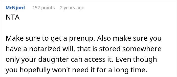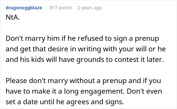 People in the comments agreed that the fiancé has no right to claim the OP’s property in this matter because he didn’t contribute to it and they haven’t been together for that long either. They also considered it not fair that OP’s daughter would get only one third of the money when she only has her mom and the stepchildren have both of their parents and a stepmom.