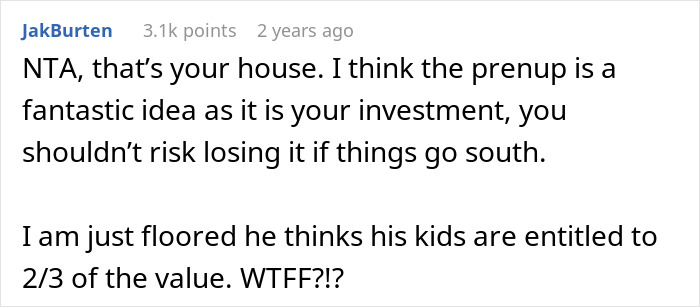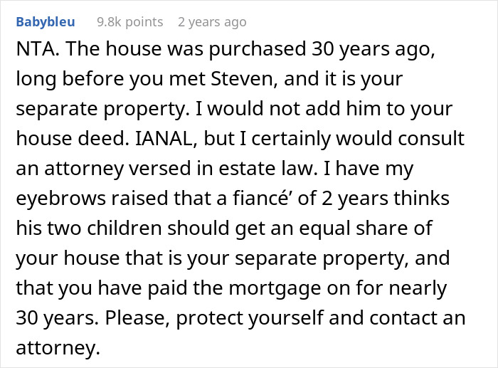 Load More Replies...Me? I would call the engagement off and cut this goldigger man loose. At the very least, I would never ever ever merge finances with him. If he can’t provide for his own children without the sale value of my house, then he’s a deadbeat dad who will use up my money and assets, and never provide for anybody but himself.
