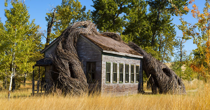 A gnarled, twisted, organic tornado of weaved sticks and twigs wraps itself around and within a building that appears to be a weathered 18th century schoolhouse. The twist? The building was actually constructed in 2016 as an interior space to protect Dougherty’s sculpture. Designers simulated authentic decay by studying the paint, water damage, rusted nails, and missing shelves of an existing schoolhouse and replicating the ghostly look and feel in an entirely new structure. One important detail was to maintain the effect of light filtering through a worn and cracked roof without leaving the twig sculpture exposed to falling rain and snow. To achieve the effect of the light while protecting the interior, acrylic sheets clear enough to appear invisible to the naked eye were sandwiched between planks in the ceiling.