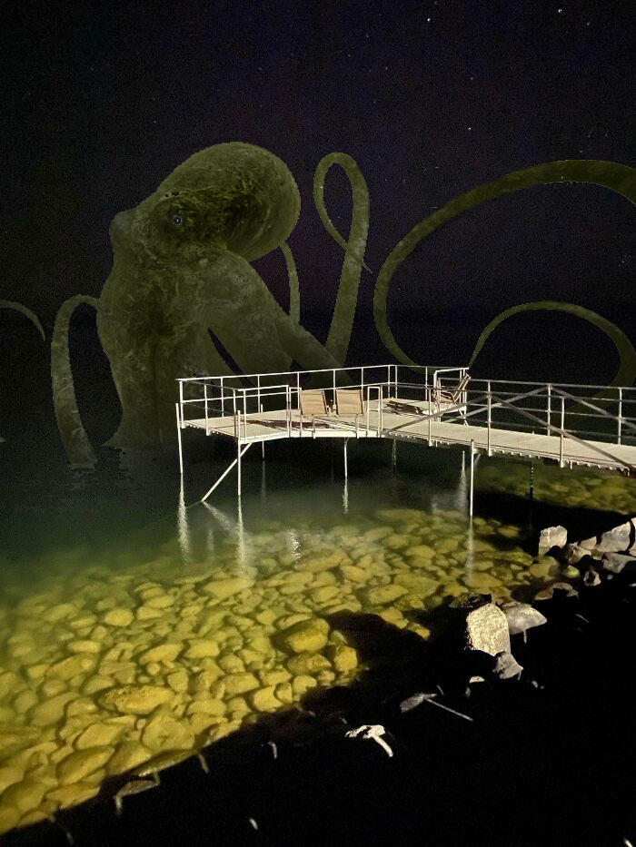 Beware the rock monsters they are swarming the beaches! Not scary but if you are used to not seeing through the water, like a lake, then I can see were its interesting but not spooky. On a second look I see an optical delusion toward bottom left. The darker stones look water monster like. 😉