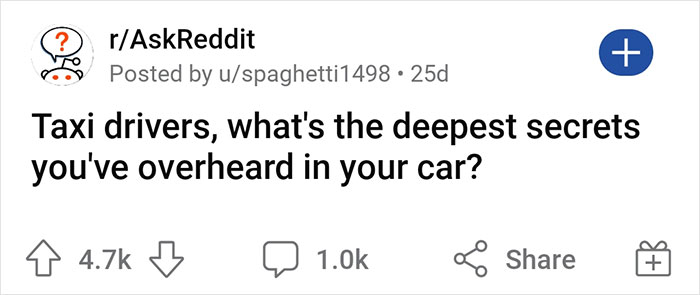 Interested in these unintentional confessions, Redditor u/spaghetti1498 recently submitted this question to the platform: "Taxi drivers, what's the deepest secrets you've overheard in your car?"
