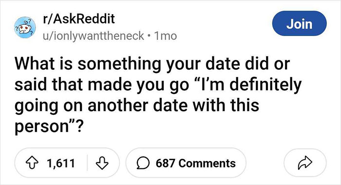 "I was talking with my GF on why I was sure I'd go on a second date with her. Then, I thought this might be fun to ask others. Turned out to be a fun question with a lot of great stories from everyone [who] commented."