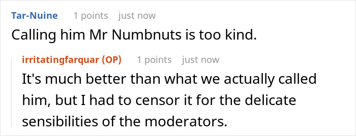Others thought that referring to the boss as Mr. Numbnuts was too kind, but compromises have to be made in civil subreddits. OP mentioned that there is an actual name the boss is called and it would break the internet if mentioned.