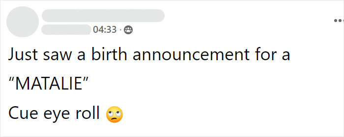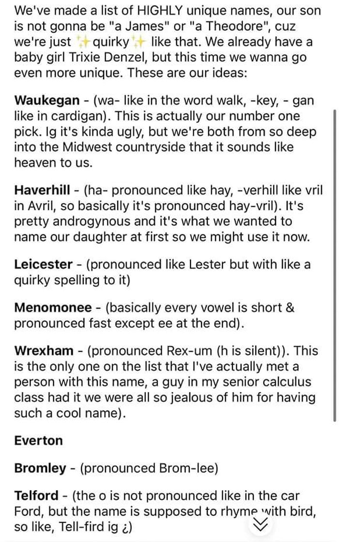 Load More Replies...I've said this in the last one of these threads, but it bears repeating... I have a very unusual first name, that requires an explanation to EVERYONE I meet. Parents, please do not do this to your children. You're not naming a designer teacup poodle, you are naming a future adult who will have to put that Ootsey Cutesy name at the top of their resume.