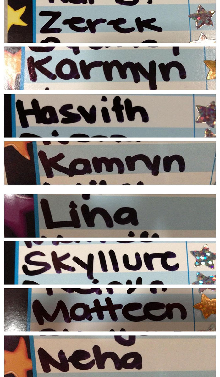 The Class List For My Little Cousin. Most Of These Are Normal But Wtf Is Up With Ahlevyr And Oakleighia. And Yes Apparently That First One Is Supposed To Be Oliver. For The Record My Cousin Is Ethan So No Tragedeigh There