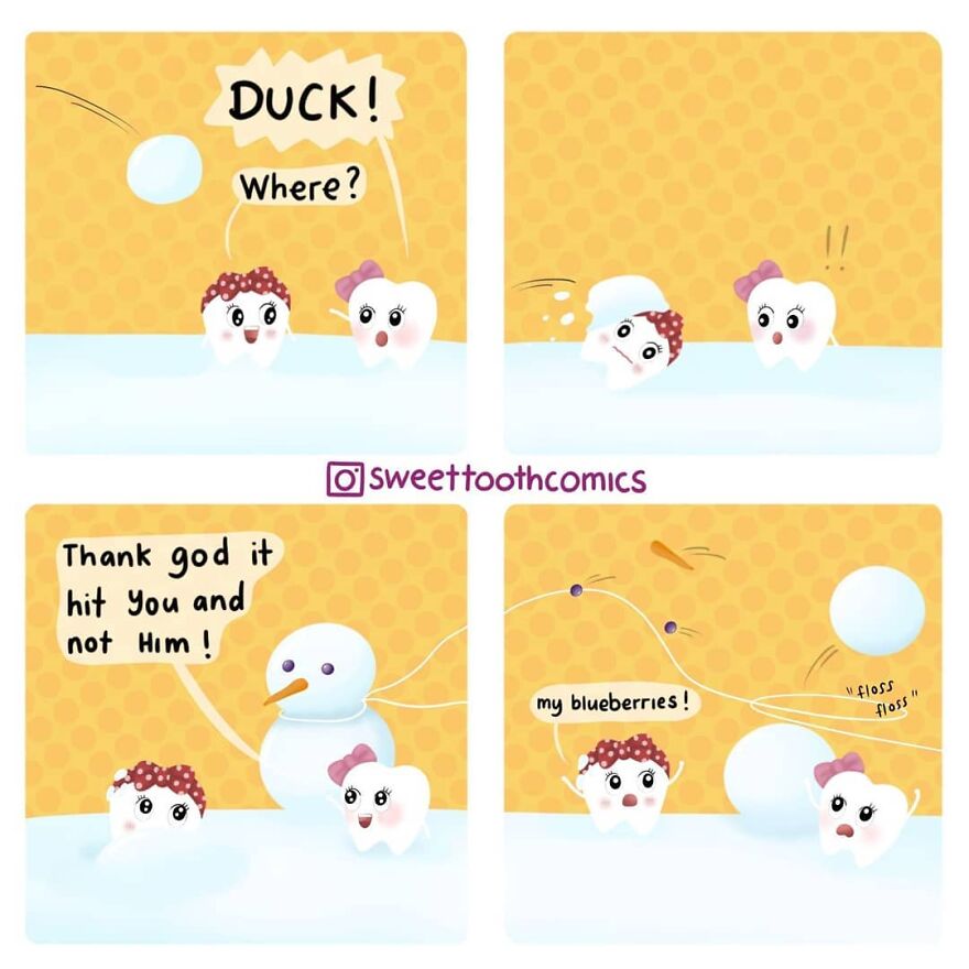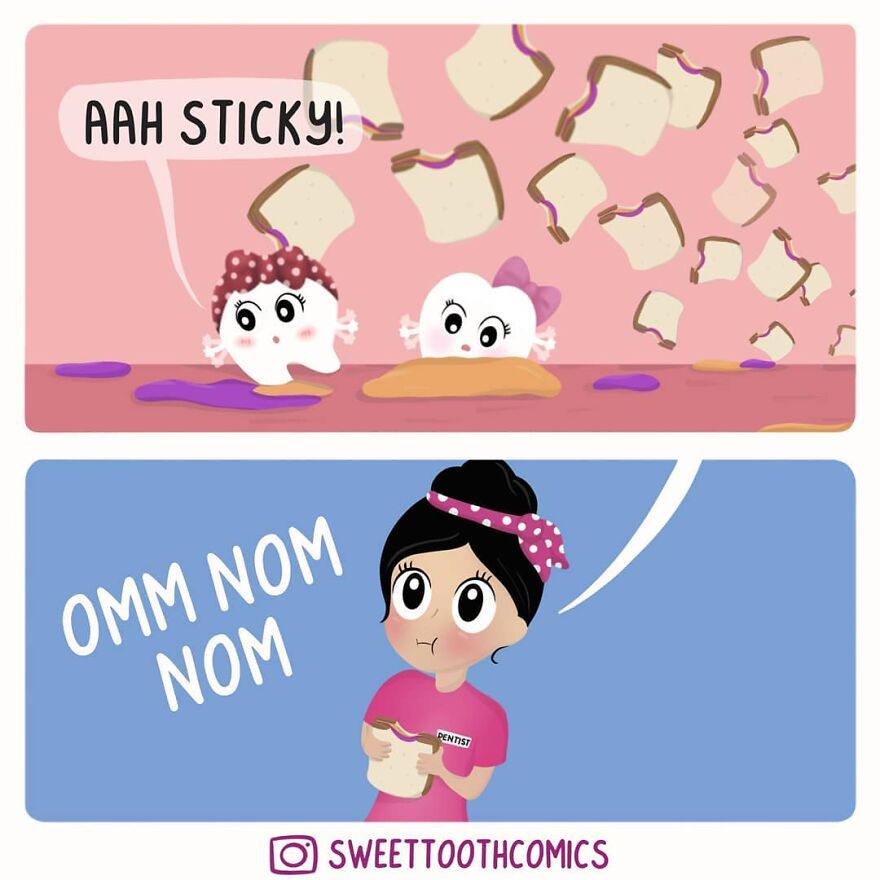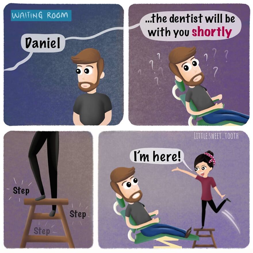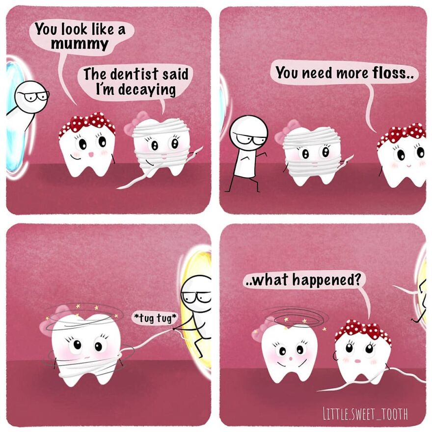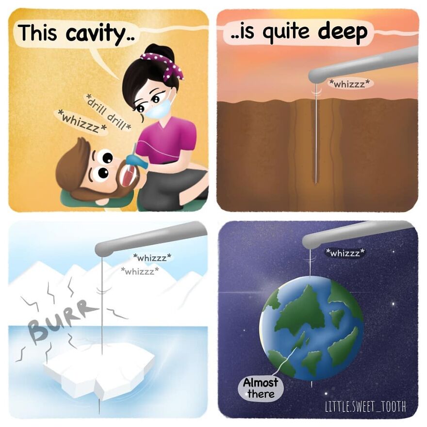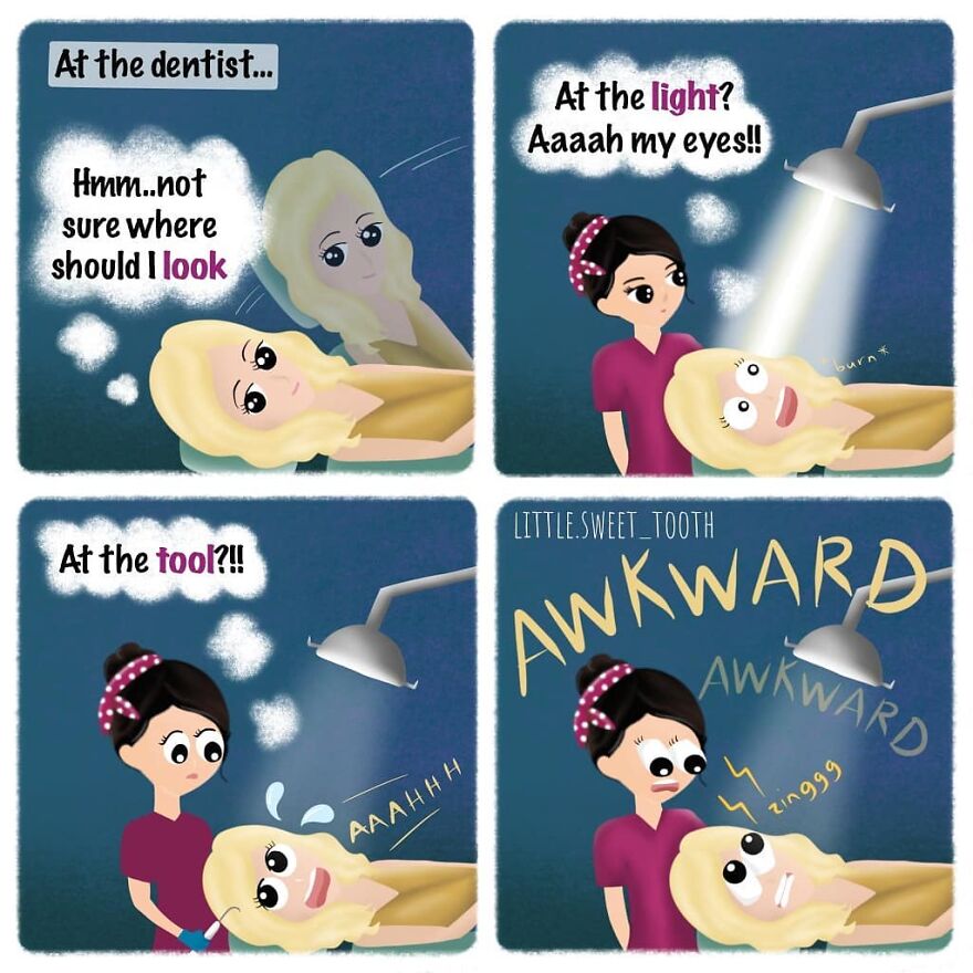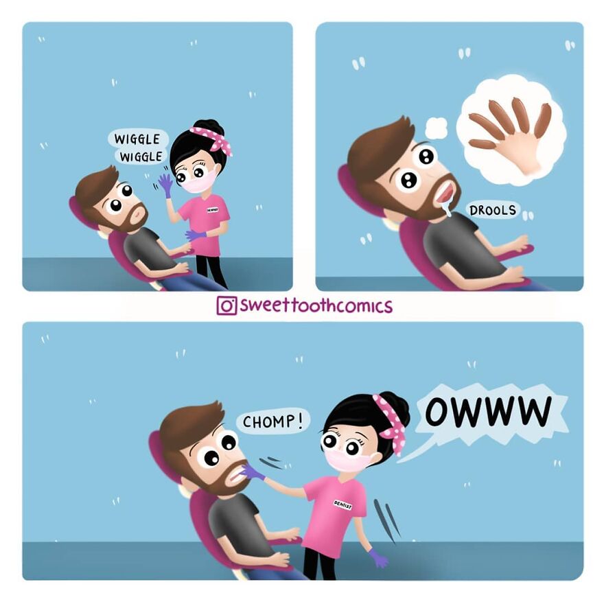"I work as a dentist and have always loved illustrating and making up cute humor. I initially started getting ideas for comics while I was working and started drawing them and posting them on Instagram. My main reason for creating at the time was just for my own enjoyment and as a relaxing outlet for stress, and eventually, I started getting feedback from readers that it helped them with their fear of the dentist and that they enjoyed my content, which then became my inspiration."