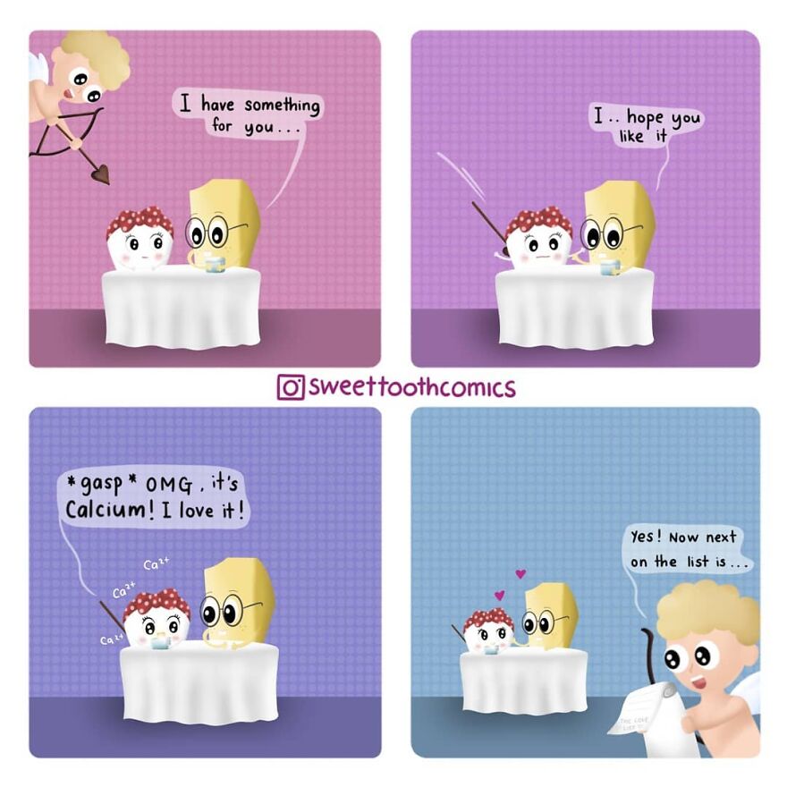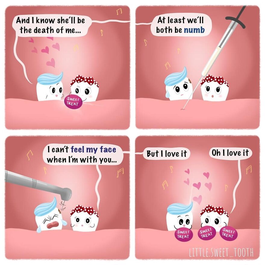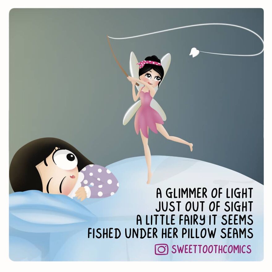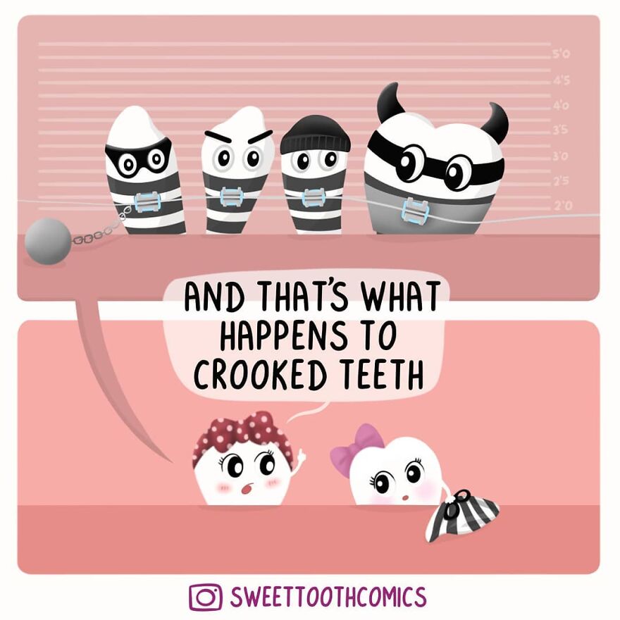 "Haha, believe it or not, stress did. I was not doing any creative work for almost 5 years and I started feeling like something was missing. One night, after a long day at work, I drew a little tooth, put a bow on her head and named her SweetTooth. The same night I started an Instagram account and called it 'little.sweet_tooth' and posted that illustration. I started posting more elaborate art mixed with humor and it eventually evolved to comics and I renamed it “sweettoothcomics”."