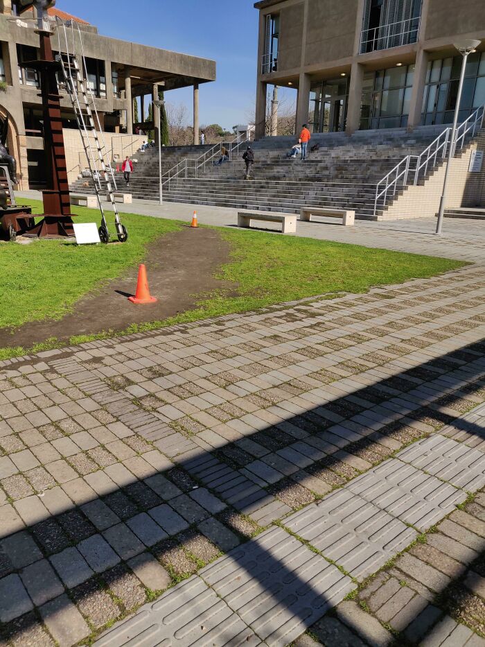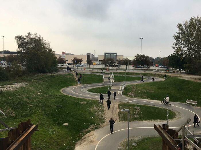 "Mankind moves like water, always prefers the shortest way possible." Architects and landscape architects who design longer "more beautiful" routes and ignore this basic traffic knowledge deserve to be shot by martial law. (This is the hill I'll die on, I'm a parcel deliverer 😡)--- Every pedestrian suffers and swears silently... What's the point in making your customers uncomfortable??! Like in the picture above: A sliiight curve in a shorter way would have been okay (like the shortcut created by "walking voters"), the paved craziness is just a sad sight.