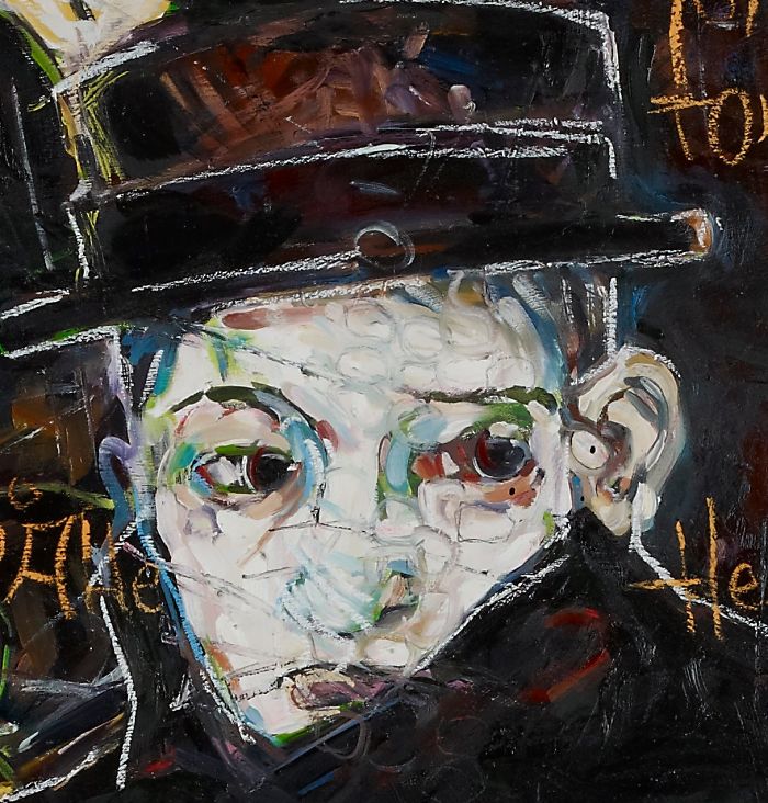 Oil & oil pastel on aerosol on 48″ x 48″ masonite. “Un simple soldat” is a portrait of a 19 year old Russian solder during WWI.H’es looking into the distance, at war while remembering his home & trying to feel a connection to his mother. The text,
