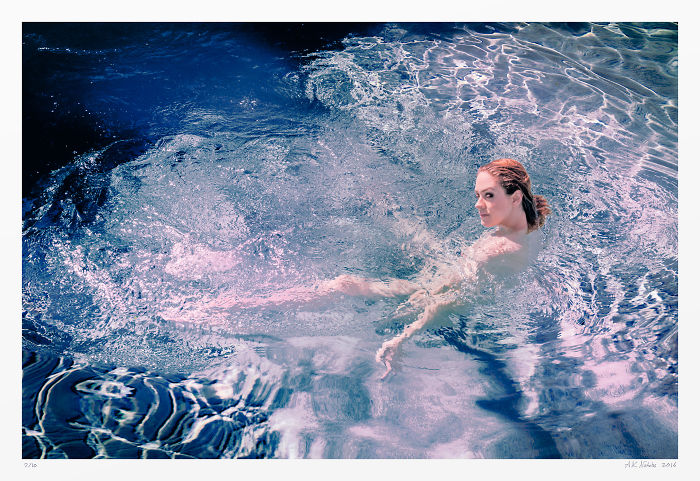 Hues of pale rosé, cobalt and ultramarine swirl around this composition. It is simultaneously cold and hot, like an effervescent eruption. A dark calmness dominates the upper left corner, slowly giving way to turbulence and light. The skinny-dipper’s body fades into the ripples and she seems to be changing direction.