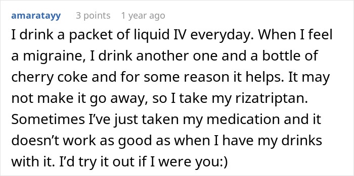 User comment explaining how drinking cherry coke and liquid IV may help relieve migraine symptoms.