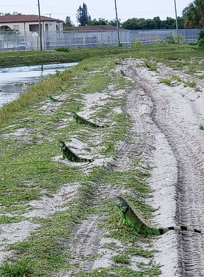 Iguanas All Lining Up At A Canal Where My Mom Lives In Southern Florida