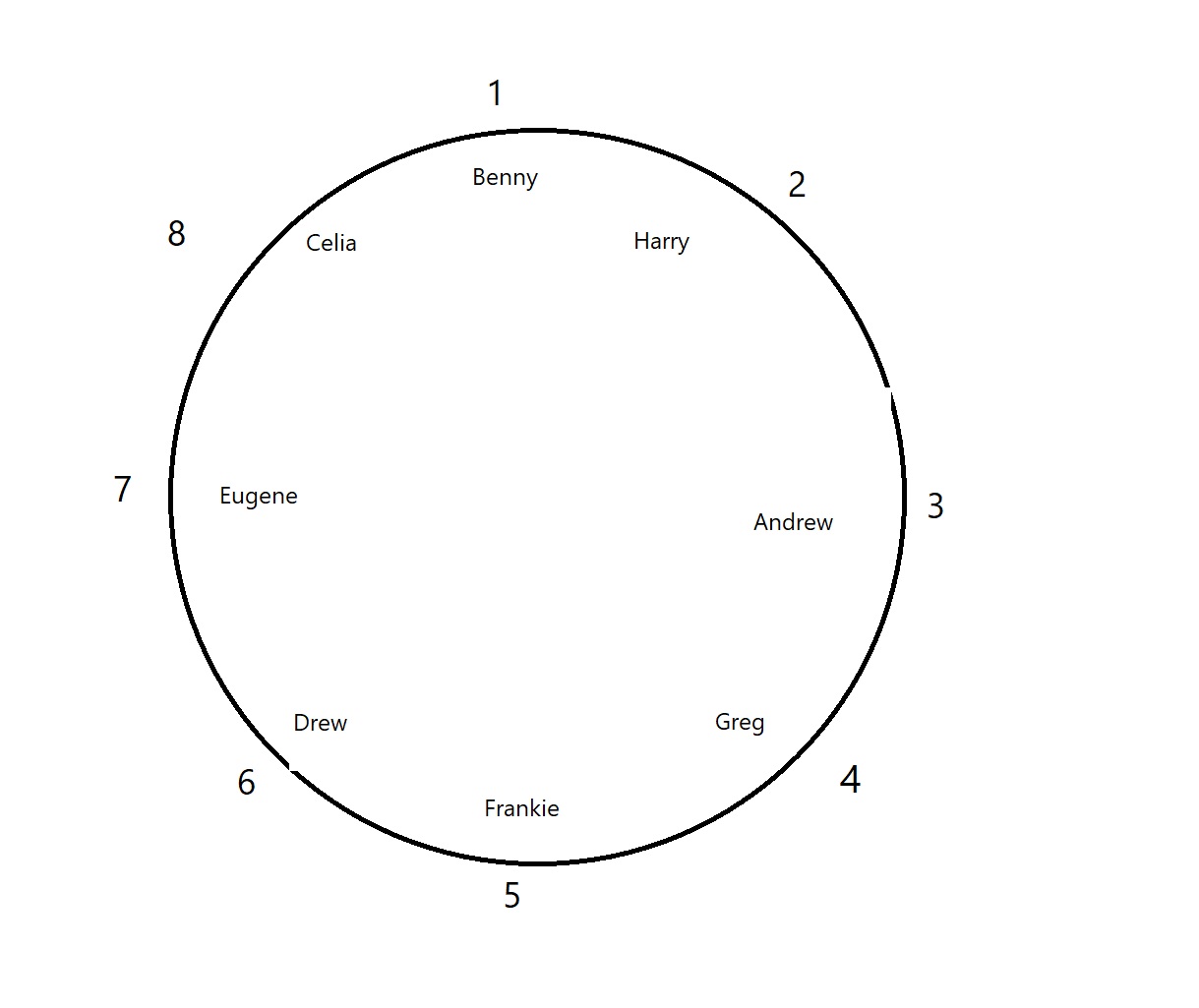 Load More Replies...#7 presumes everyone is spread around the table evenly. Even so, although the answer is correct, the reasoning is wrong. Frankie and Drew sit next to each other. Eugene sits between Drew and Celia, so that means its Frankie, Drew, Eugene and Celia. Then Benny sits between Celia and Harry, so it's Frankie, Drew, Eugene, Celia, Benny, Harry, followed by Andrew and Greg or Greg and Andrew before we wrap back around to Frankie. Andrew *could* sit next to Harry, leaving Greg between him and Frankie. That would be consistent with Celia being opposite Greg. And Drew is three away from Harry in neither direction. However, this means the order starting from Benny and heading towards Harry is Benny, Harry, Andrew, Greg, Frankie, Drew, Eugene, Celia.