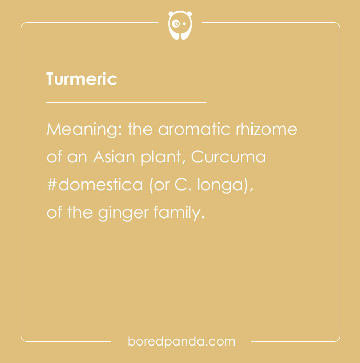 Meaning: the aromatic rhizome of an Asian plant, Curcuma domestica (or C. longa), of the ginger family.