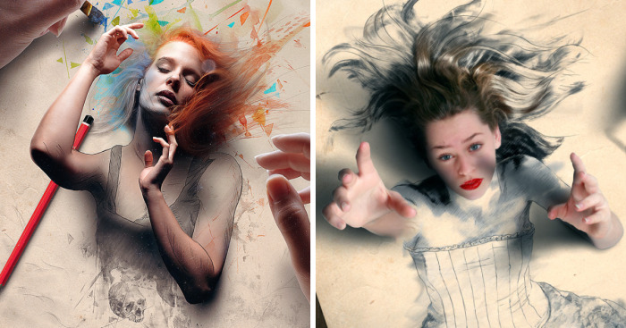 Tullius mixes images to create his own realities with touches of surrealism and often a certain somber bias and terror with figures that are surpassing the limits of his drawings.