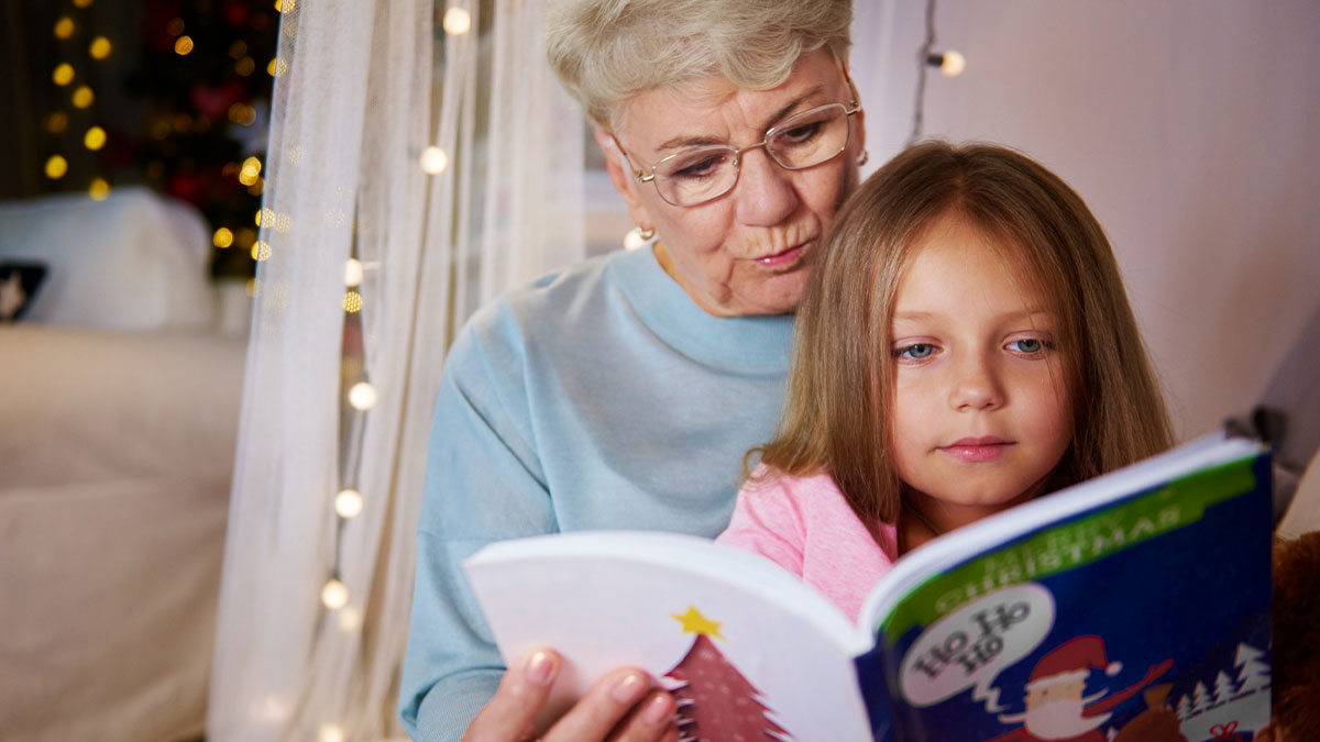 Grandma reading a book to grandkid, enjoying free childcare perks while teaching the child to read at home.