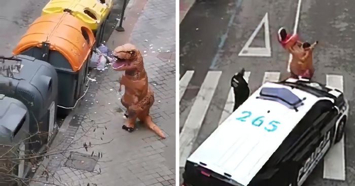 The Police Department of Murcia recently released a video of a man dressed in a full T-Rex outfit walking down one of the residential streets of the Vistalegre neighborhood. The video seems to be shot by a resident filming the incident from their balcony. And yes, that is the Jurassic Park theme song playing in the background.