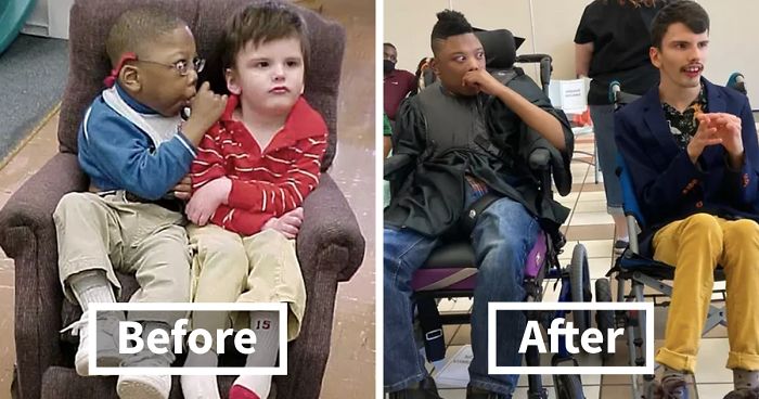 The parents of two boys, Odin Frost and Jordon Granberry, were given grim prospects when they were born. They were told that their sons would never be able to walk and would live in a vegetative state, given they’d survived their early years. But 18 years have already passed and the teenagers have just graduated from high school. The pair really beat all odds and exceeded all expectations. And after one of the boys’ father shared a photo showing them on their very first day at school, and at their graduation, the internet just fell in love.