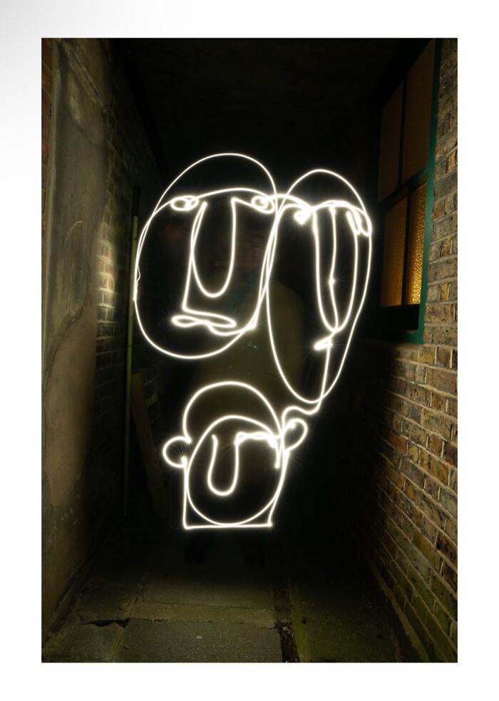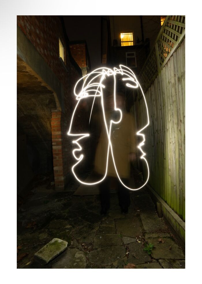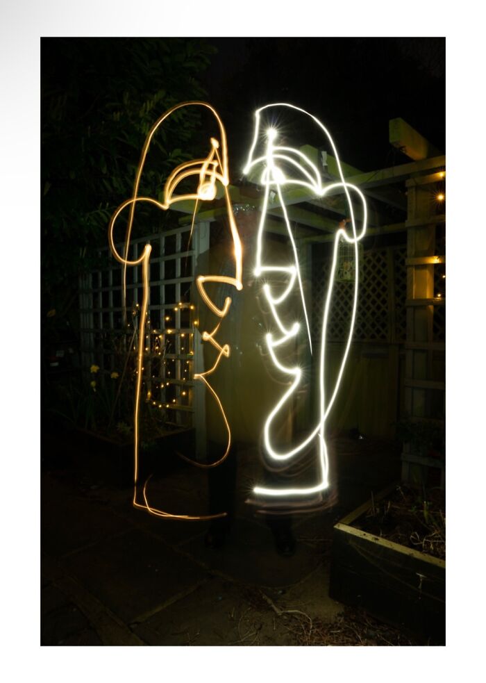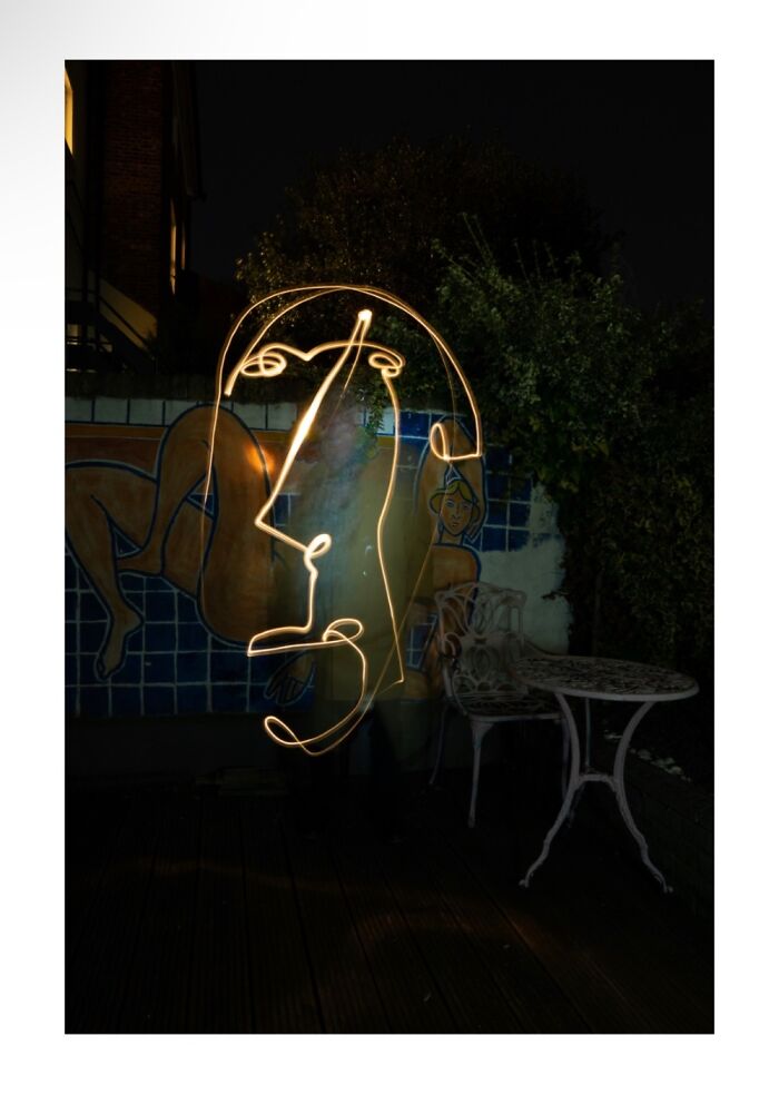I created a series of 6 images using the light graffiti technique and with the help of the artist Weef Smith, a friend of mine. The images successively depict the stages from loneliness and love, to family and its destruction: Her alone, then Picasso alone, both of them falling in love, forming a family, having a child, and him running away and leaving his family. These 6 pictures were taken in the garden of the artist Weef in 4 separate meetings.