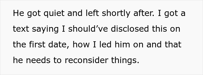 The author of the post only laughed at this and asked: “So you’re turned off by me?” Max was extremely surprised, and then the woman told him that she also had implants. The boyfriend did not believe her at first, and she even had to show him some of her old photos. The man fell silent and just left shortly after. And some time later, the OP got a message from him, saying she should’ve disclosed this on the first date, how she led him on and that he needs to reconsider things.