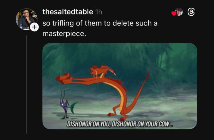 Even now that the thread has been deleted, people can still go to Disney's Threads account and find people addressing the situation. The top comments with over two thousand "likes" are all in the vein of continuing the discussion. "Never dirty delete," user @thatladyfromrichmond wrote, accompanied by a GIF from the 1998 Mulan. "Shame on you, Disney. You know better, because you taught us better," another user, @artemislynne, wrote.