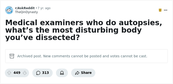 (She was talking about an anorexic girl) " I posted before about wanting to do her autopsy (it's my job, I'm not creepy). Finally did one on someone who was even thinner last week. Their spinal column stuck out through their stomach while lying on their back. This person had been like that for 7 years and all organs were black and green and the skull was yellow and extremely thin. The organs were tiny and rested on either side of the spine with nothing on the spinal column. Thyroid bone was 100% visible through the neck skin. The muscles that sit over the skull were basically non-existant. A*****e was a hole sitting over the tailbone. The brain was literal mush as were the lungs. Their liver was half the size of a normal liver. The intestines were mostly dead and just fell apart to the touch. "