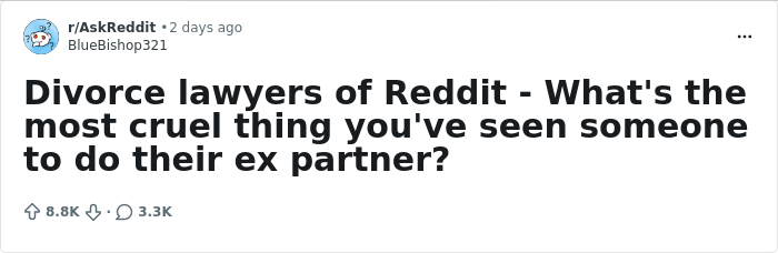 Take these responses from a recent Reddit thread. Originally directed at lawyers, everyone who had been in or knew someone who went through a toxic divorce eventually chimed in. Many of these are heavy stuff and potentially triggering, so do proceed with caution.