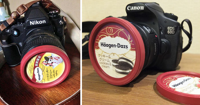 Most of us see ice cream as a way to fill our stomachs, but, as it turns out, it may also be used to protect your photography gear! One Japanese photographer has discovered that some of Häagen-Dazs ice cream container lids are perfect for 72 mm lenses. And, as his other colleagues have tested, the brand of the camera is not really important – it suits them all.