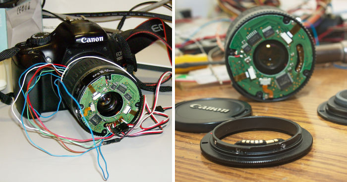 So an idea came from a Youtube video (see in links): modify a cheap Canon 18-55 for reversing, with pulling control signals from the bayonet to the front of the camera (which became the backside now).
