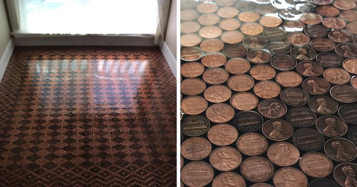 Woman Uses 13,000 Pennies To Renovate Old Floor And Turn It Into Stunning Patterns