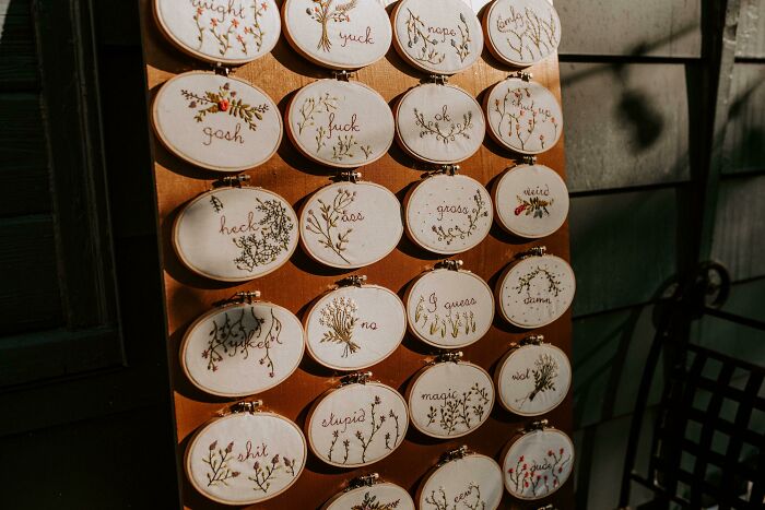 My Favorite Detail From Our 9/28 Wedding: I Made Embroidery Hoops For Favors And All Of Them Say A Variety Of Mean/Rude/Curse Words