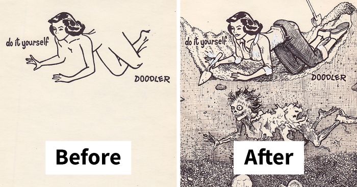 “The half-drawn pin-up girls serve as the inspiration..I just imagine what they could be doing and then figure out how to create the world around them,” Jablow detailed his drawing ideas. “Every one is a new but familiar challenge.” The "Do It Yourself Doodler" series was the very beginning of his artistic journey into the world of doodling over pieces and the artist's creative journey into placing soulless templates into colorful and detailed worlds.