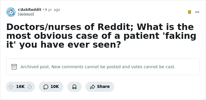 However, faking an illness with a medical professional is a different scenario, and a foolish one to be in, at that. However, that didn’t stop these individuals from engaging in such behavior, as evidenced by this Reddit thread from a while back.