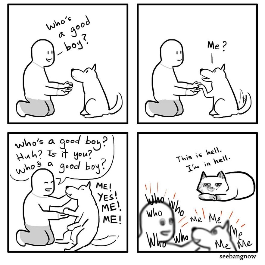 I don't know about your shower thoughts, but I often think about what dogs really think. Do they really not judge us? Do they really know that they're good girls and boys? Do they really look up to us? These and other questions are answered by Xibang (Seebangnow), an illustrator from Singapore, who also recently did similar comics about cats. Of course, I'll never really know what dogs actually think, but the comics illustrate their thoughts pretty accurately, or at least it's what most of us hope that dogs think.