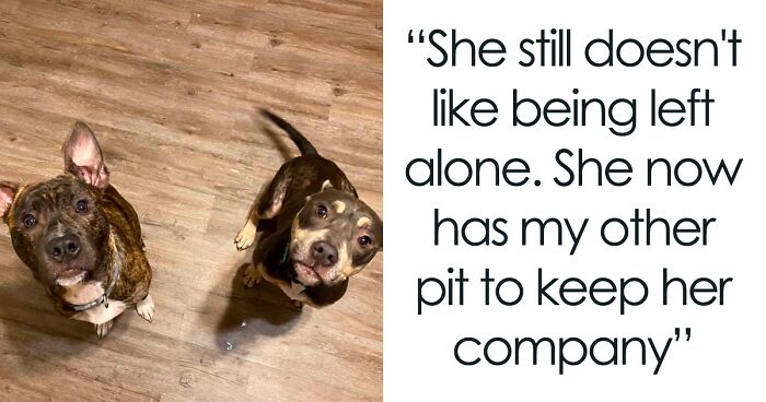 “She was scared. She still doesn’t like being left alone. We have had her for almost a month now, and she cries if she’s alone. She now has my other pit to keep her company. But she doesn’t like being in a place alone; she does well in her crate, though.”