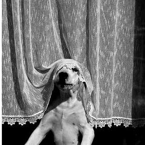 Dog lying on asphalt behind fence casting striped shadows, creating an adorable dog meme effect.