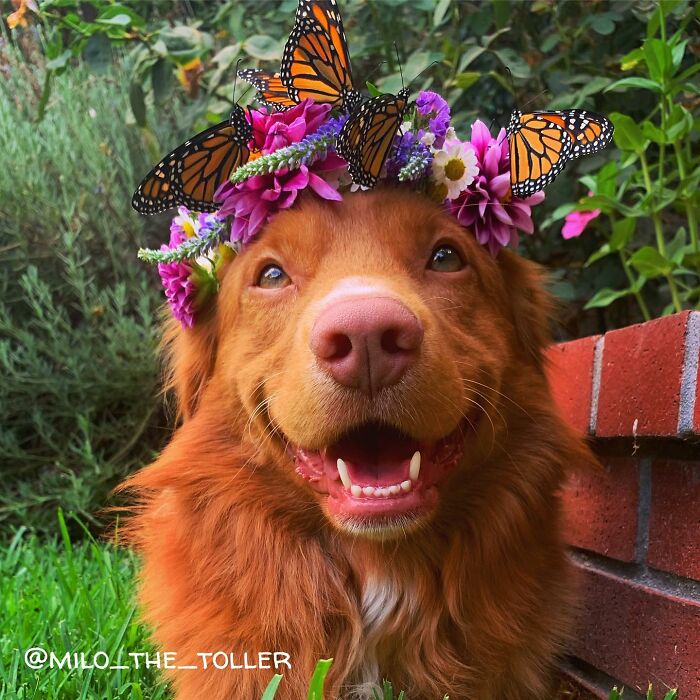 Four years ago, Bored Panda readers met Milo, a Duck Tolling Retriever from Nova Scotia. The adorable creature captured everyone's hearts with his love for walking in the garden with butterflies. His owner, Jennifer Bennett, lovingly called him “a born king of butterflies.”