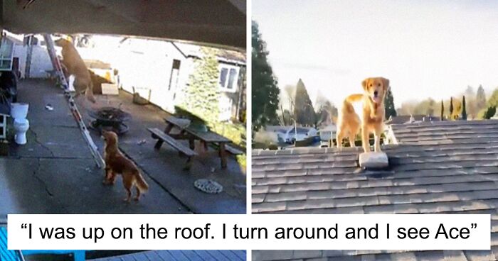 The owner shared with Bored Panda: “Ace—the dog that was climbing, I’ve had since he was a puppy and he just turned 2 years old last week on the 14th. Super adventurous and not fearful at all. The dog on the ground is Bo, who I adopted from ‘Golden Bond Rescue’ in March! Bo is the cuddly one. I was up on the roof taking down my Christmas lights. I was on the other end of the house, I turn around and see Ace on the roof! I thought maybe a roommate was playing tricks on me and put Ace up there, but I checked my security camera and to my surprise, he climbed up the ladder!”