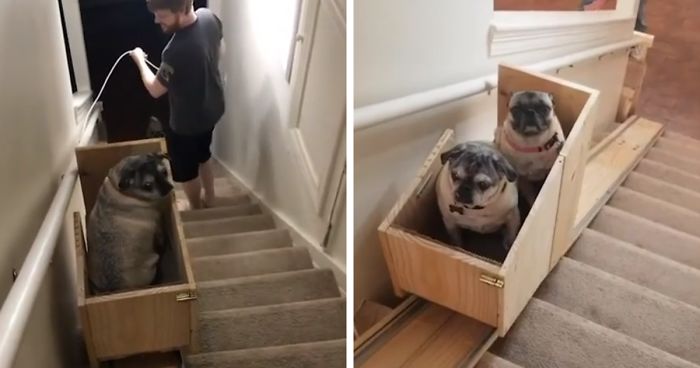 Dog Owner Builds A ‘Doggie-Vator’ Stairlift For Her Three Elderly Rescued Pugs And People Find It Adorable