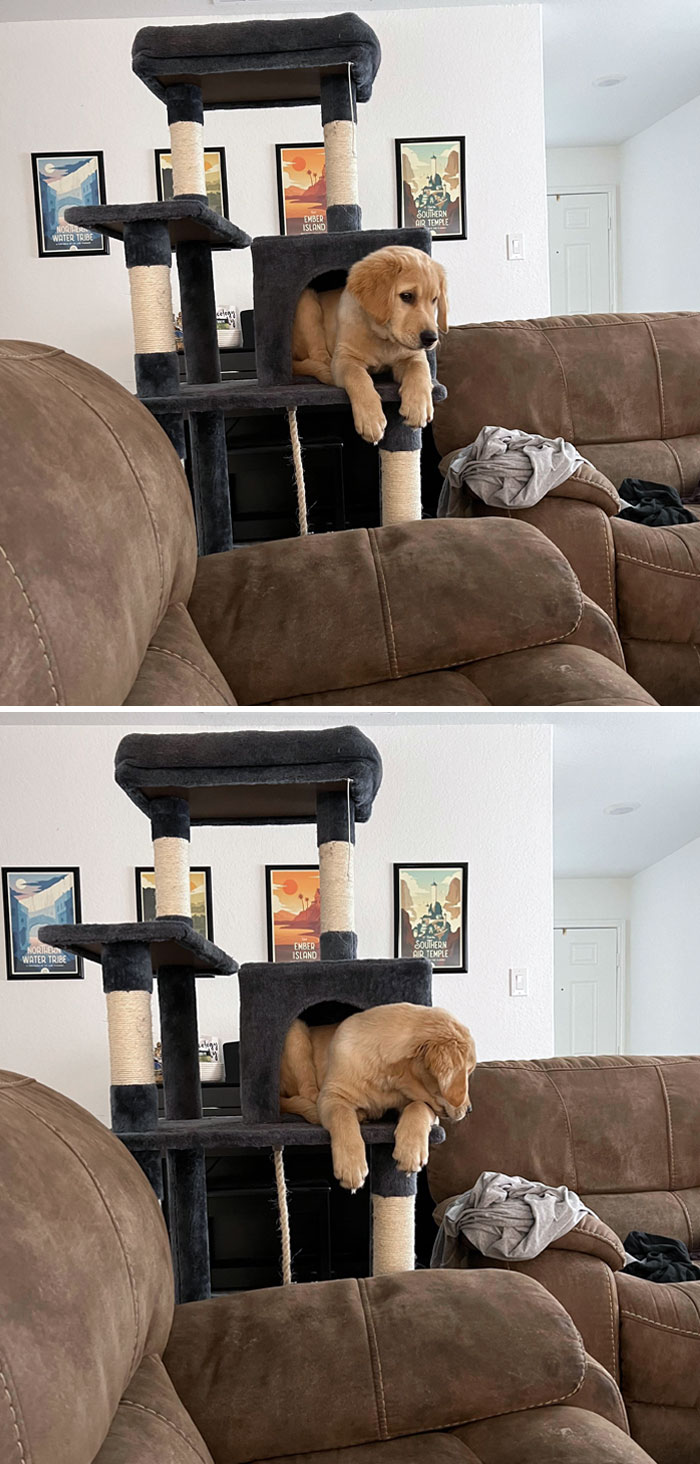 This Is What Happens When You Raise A Golden With Cats. I Was Sitting On The Couch And Glanced Over To See Him Crawling Up Onto The Cat Tree. No Idea Why He Felt The Need To Do This