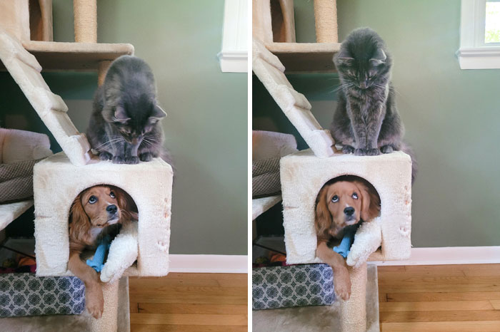 Well, at least about these adorable doggos who are totally convinced they’re cats. From climbing the tallest surfaces, invading cat trees, and sleeping curled up in a box, scroll down to see the most adorable pooches that are better at living the feline life than the canine one.
