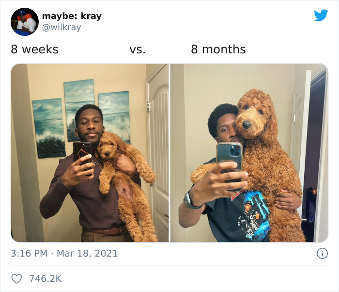 That's exactly what Twitter user @wilkray proved by showing a picture of his pupper Pier at 8 weeks and 8 months. The difference is huge. Pier grew up to be a big dog, as he's not even done growing! People on Twitter liked what they saw. As of right now, the picture has over 700k likes and has even started its own thread. In the thread, people are sharing their own puppers and how much they've grown in a few weeks, months, or years. The whole thread is adorable and it's bound to make you smile.